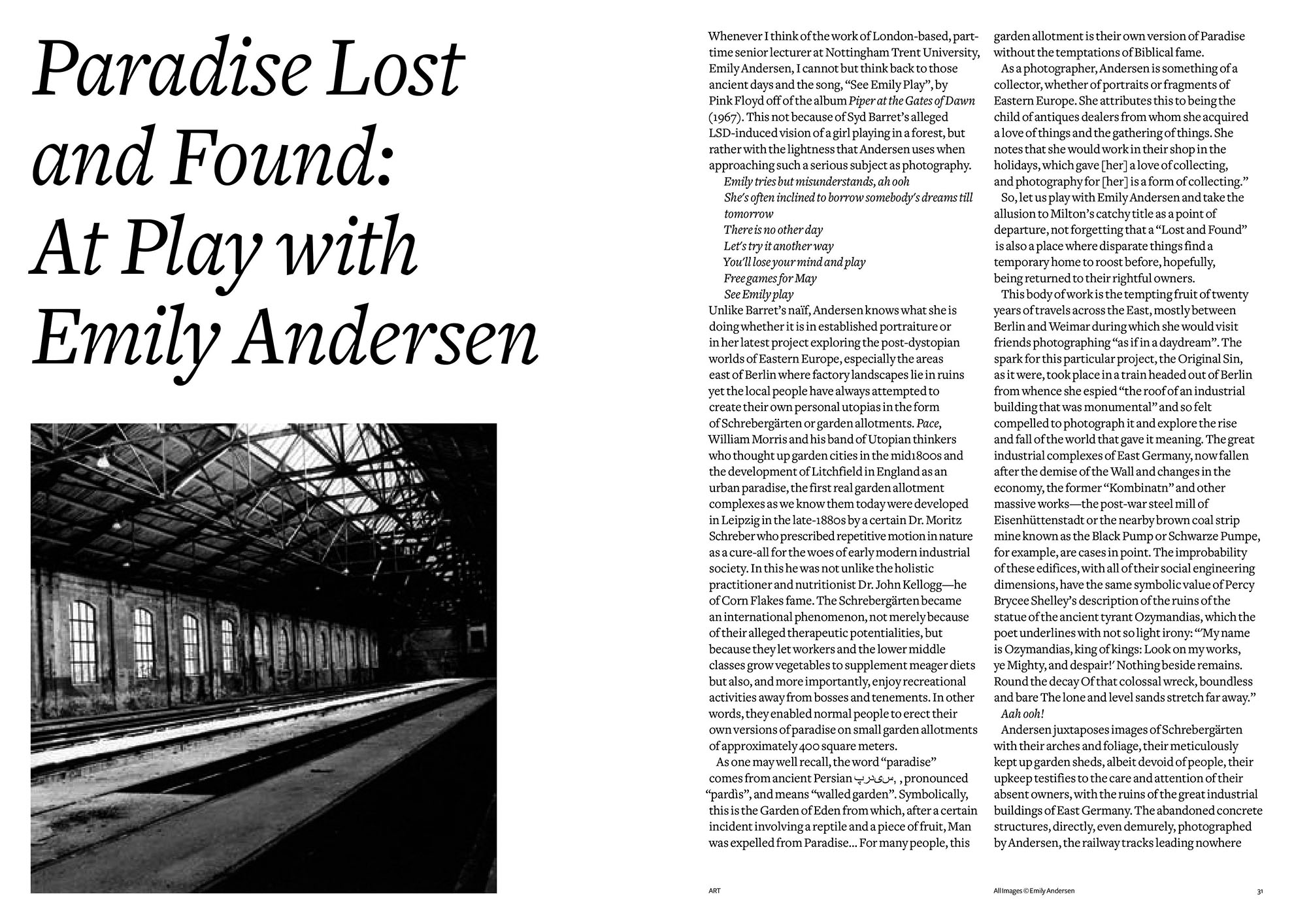"She has chosen a wide-ranging set of subjects: British photographer Emily Andersen's work encompasses portraits, aerial, landscape and architectural photographs. Although Paradise Lost & Found is Ms Andersen's first show in Germany, she has already travelled the country extensively over several years, capturing industrial ruins, allotments or abandoned theme parks with her camera - and thereby uncovering the odd hidden paradise."